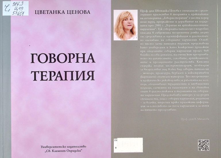 ЦБ 51651, Ч1/376.3/Ц 49 ЦЕНОВА, Цветанка Луканова Говорна терапия : Практическо ръководство / Цветанка Ценова ; Рец. Ваня Матанова. - 3. изд. - София : Унив. изд. Св. Климент Охридски, 2019. - 252 с. : с ил., табл. и диагр., [50] л. : цв. ил. ; 23 см Библиогр.: с. 251. ISBN 978-954-07-4738-5 Сист. N: 174896 |