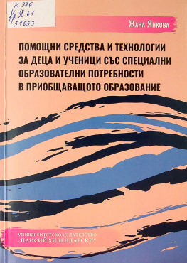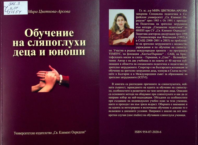 ЦБ 51654, Ч1/376.3/Ц 34 ЦВЕТКОВА-АРСОВА, Мира Димитрова Обучение на сляпоглухи деца и юноши : [Монография] / Мира Цветкова-Арсова = Education of Deafblind Cildren and Youths / Mira Tzvetkova-Arsova. - София : Унив. изд. Св. Климент Охридски, 2004. - 387 с. : с табл., сх., ил. ; 24 см Съдържа и: Организации на и за сляпоглухи ; Компетенции на учители на сляпоглухи ; Измерения на общуването при сляпоглухи Библиогр. след всяка гл. - Биогр. данни за авт. на кор. ISBN 954-07-2020-6 Сист. N: 174909 |
