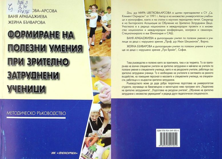 ЦБ 51656, Ч1/376.3/Ц 34 ЦВЕТКОВА-АРСОВА, Мира Димитрова и др. Формиране на полезни умения при зрително затруднени ученици : (методическо ръководство) / Мира Цветкова-Арсова, Ваня Арабаджиева, Жейна Бъчварова = Teaching daily living skills to visually impaired students : (handbook) / M. Tsvetkova-Arsova, V. Arabadzhieva, Z. Bachvarova. - София : Феномен, 2013. - 316 с. : с ил., табл. ; 24 см Рец.: Владимир Радулов, Петър Петров. - Изд. Бълг. асоц. за обучение на зрително затруднени деца. - Библиогр.: с. 311-314 ; С кратки биогрф. данни за авт. на кор. ISBN 978-954-549-105-4 Сист. N: 174912 |