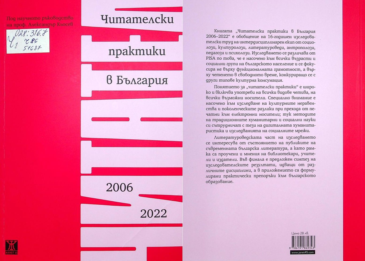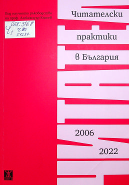 ЦБ 51687, Ч1/028:316.7/Ч 86, РВ/028:316.7/Ч 86 ЧИТАТЕЛСКИ практики в България 2006-2022 / Александър Кьосев и др. ; Под науч. ред. на Александър Кьосев. - Пловдив : Жанет-45, 2024. - 526 с. : с табл., ил., диагр. ; 24 см Др. авт.: Б. Димитрова, Е. Лилова, В. Георгиева, Е. Алексиева, Св. Близнашки, Г. Гончарова, М. Вакарелова, Ал. Главанакова, Ю. Роне, Г. Няголов, С. Тодорова, Н. Василева, М. Димитрова. - Съдържа и Препоръки за културни и образователни политики на проект "Читателски практики в България 2006 - 2018 г.". - Биогр. данни за авт. с. 518-524 ; Рез. на англ. ез. ISBN 978-619-186-934-3 Сист. N: 174988 |