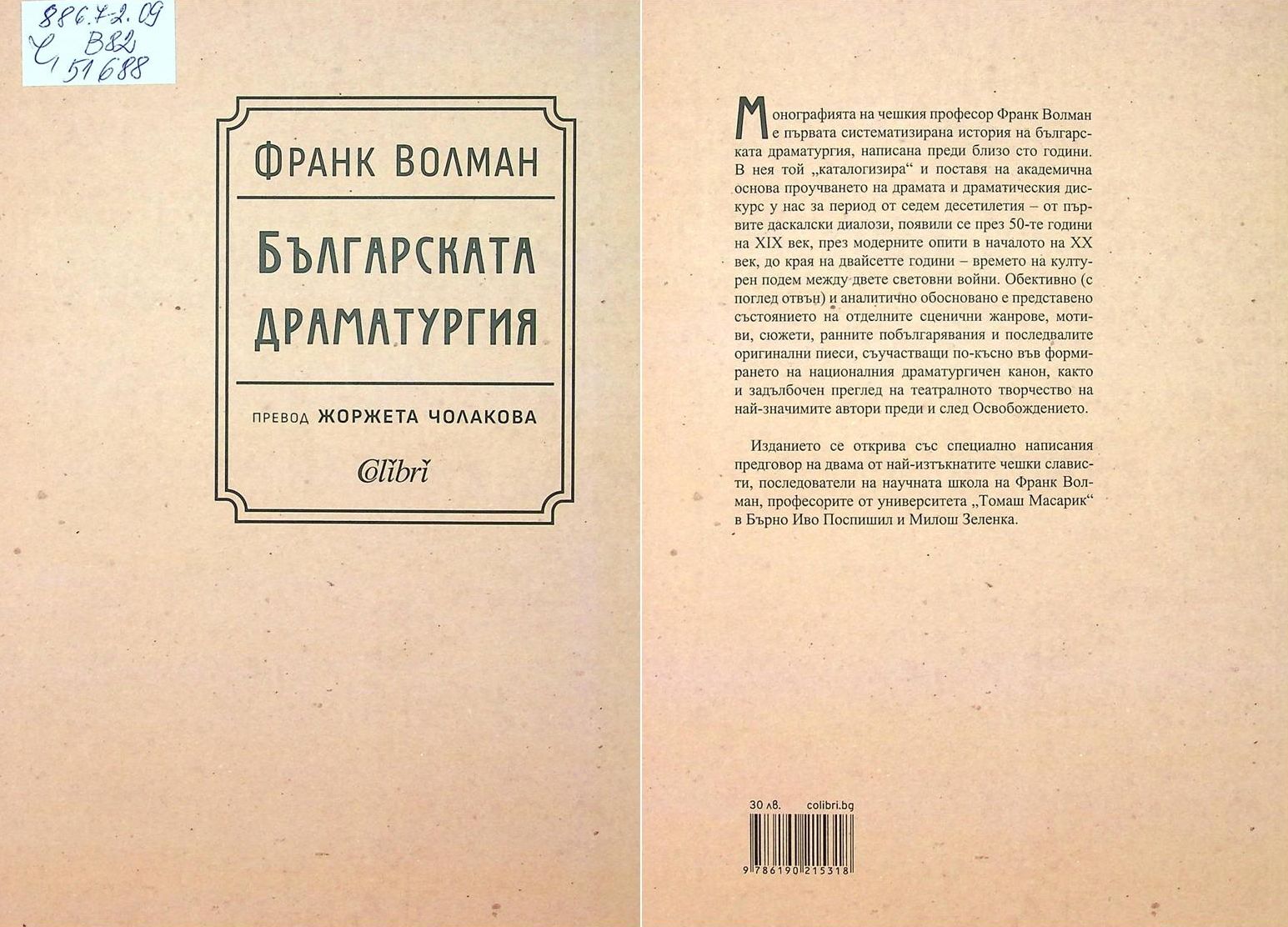 ЦБ 51688, Ч1/886.7-2.09/В 82 ВОЛМАН, Франк Българската драматургия / Франк Волман ; С предг. от авт. ; Прев. от чеш. Жоржета Чолакова ; [Статия за авт.] Иво Поспишил, Милош Зеленка ; Предг., науч. ред. и комент. апарат Людмила Малинова-Димитрова, Людмил Димитров. - София : Колибри, 2024. - 232 с. : с портр. ; 24 см С кратки биогр. данни за авт. на 2-ра кор. - Съдържа и За личността и методологията на Франк Волман / И. Поспишил, М. Зеленка ; Франк Волман и бълг. драматургия / Л. Малинова-Димитрова, Л. Димитров. - Библиогр.: с. 227-228 и под линия ; Именен показалец. ISBN 978-619-02-1531-8 (Colibri) Сист. N: 174989 |