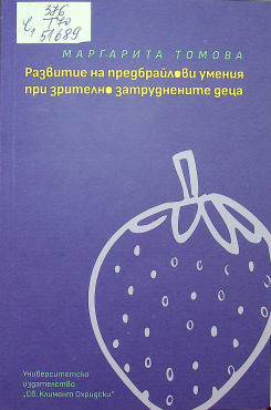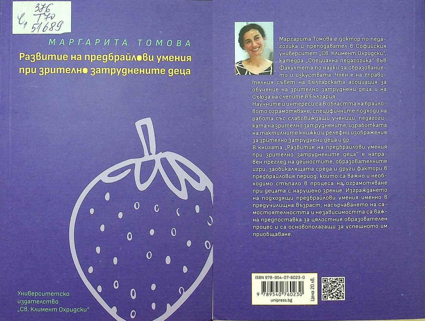 ЦБ 51689, Ч1/376/Т 70 ТОМОВА, Маргарита Венелинова Развитие на предбрайлови умения при зрително затруднените деца / Маргарита Томова ; Рец. Владимир Радулов, Мира Цветкова-Арсова. - София : Унив. изд. Св. Климент Охридски, 2024. - 228 с. : с ил., табл., сх. ; 21 см Биогр. данни за авт. отбелязани на гърба на кор. - Библиогр.: с. 175-180. ISBN 978-954-07-6023-0 Сист. N: 174996 |