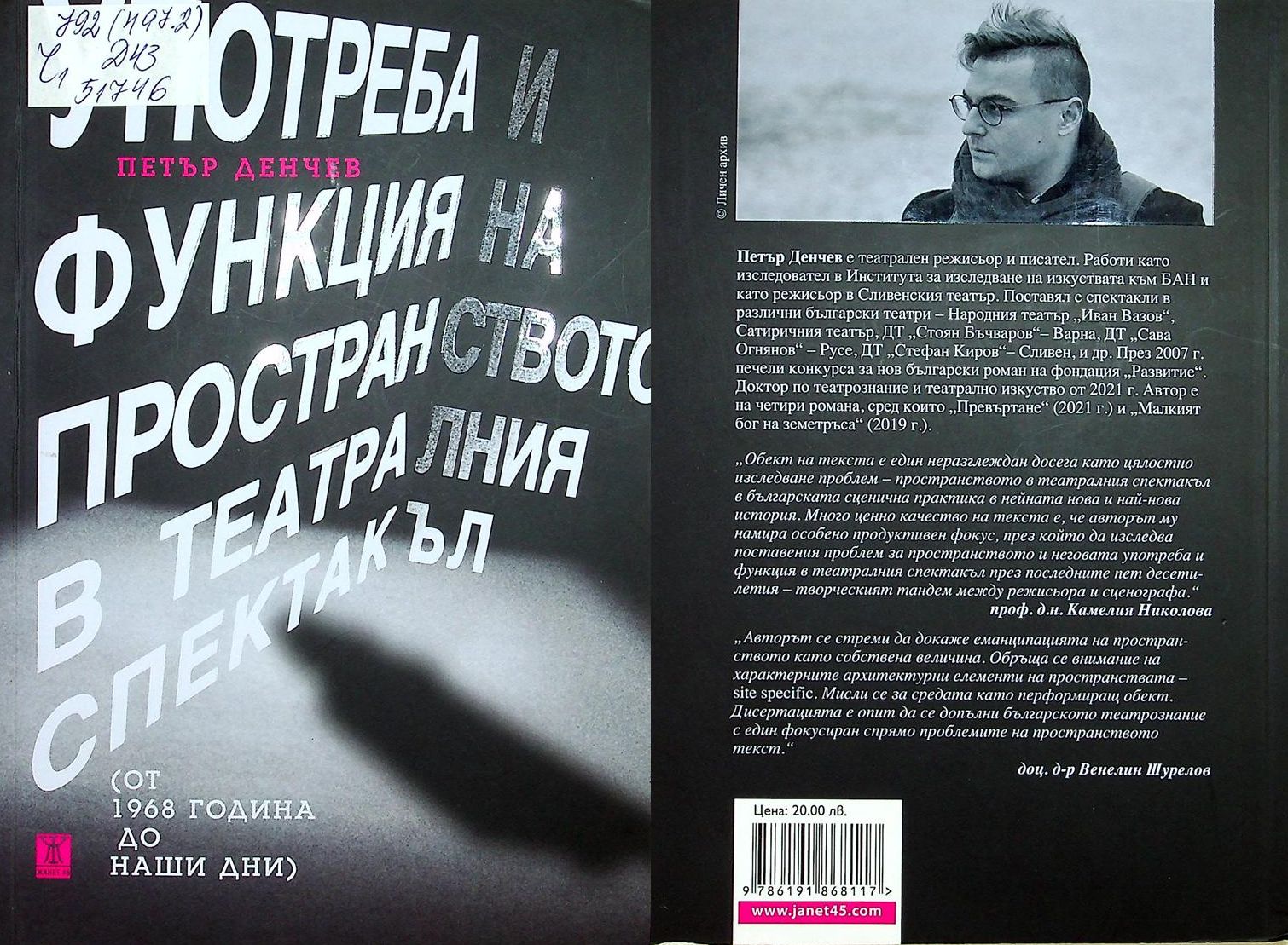 ЦБ 51746, Ч1/792(497.2)/Д 43 ДЕНЧЕВ, Петър Бориславов Употреба и функция на пространството в театралния спектакъл : (От 1968 година до наши дни) / Петър Денчев ; Науч. ред. Камелия Николова. - Пловдив : Жанет-45, 2023. - 380 с. : с ил. ; 20 см Кн. е на базата на защитен дисертационен труд. - Биогр. данни за авт.на кор. - Библиогр. с. 318-334 и под линия. ; Рез. на англ. ез. ISBN 978-619-186-811-7 Сист. N: 175095 |